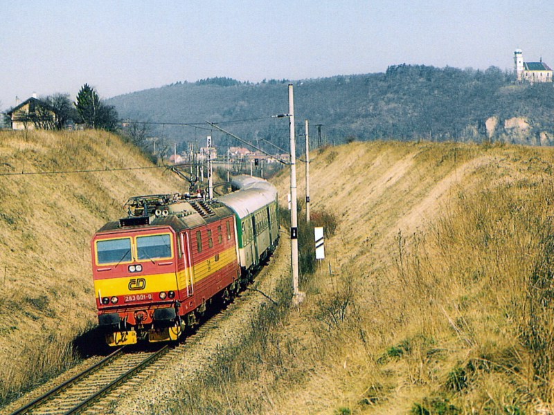 "Princezna" 263 001-0 v čele vlaku Os 4750 Vyškov na Moravě - Letovice mezi Lulčem a Komořany u Vyškova 2. 4. 2005.
