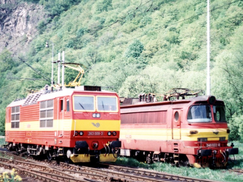 Vzpomínka na doby přepřahů elektrické a motorové trakce v Hronské Dúbravě - stroje 263 009-3 a 240 022-4 čekají na své vlaky 4. 5. 1995.