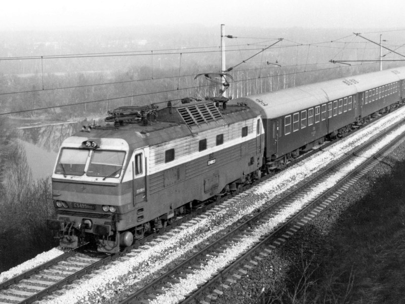 Rekreační rychlík č. 11070 "Dunaj" Bratislava - Mariánské Lázně projíždí tažen strojem ES499.0001 poblíž hradla Plzeň-Chlum 19. 3. 1989.