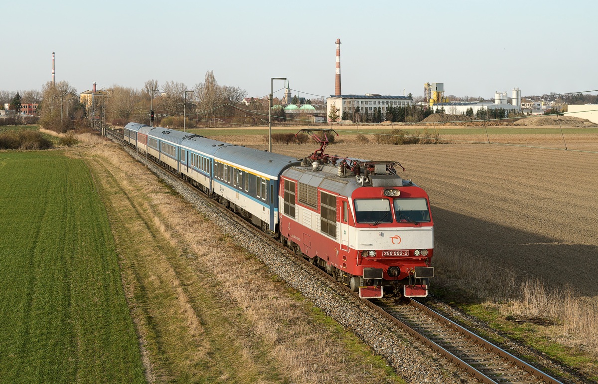 V čele odklonového vlaku EC 90126 opouští 350 002-2 Nymburk ve směru Sadská, Poříčany a Praha 20. 3. 2022.
