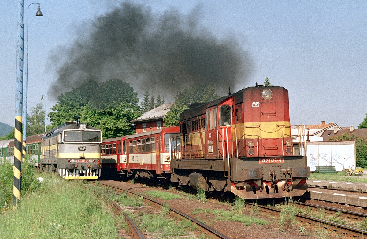 "Buchar" 742 028-4 rozjíždí osobní vlak ve Veřovicích, zatímco na vedlejší koleji postává se svým vlakem brněnský stroj 754 041-2 v červnu 2003.
