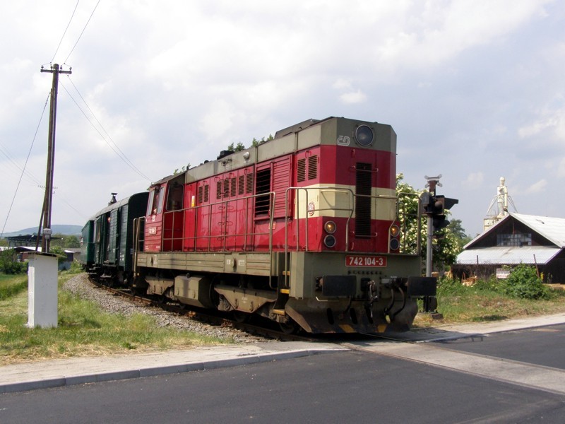 742 104-3 přiváží zvláštní vlak (na konci s párou 433.002) ze Zdounek do Zborovic 26. 5. 2007.