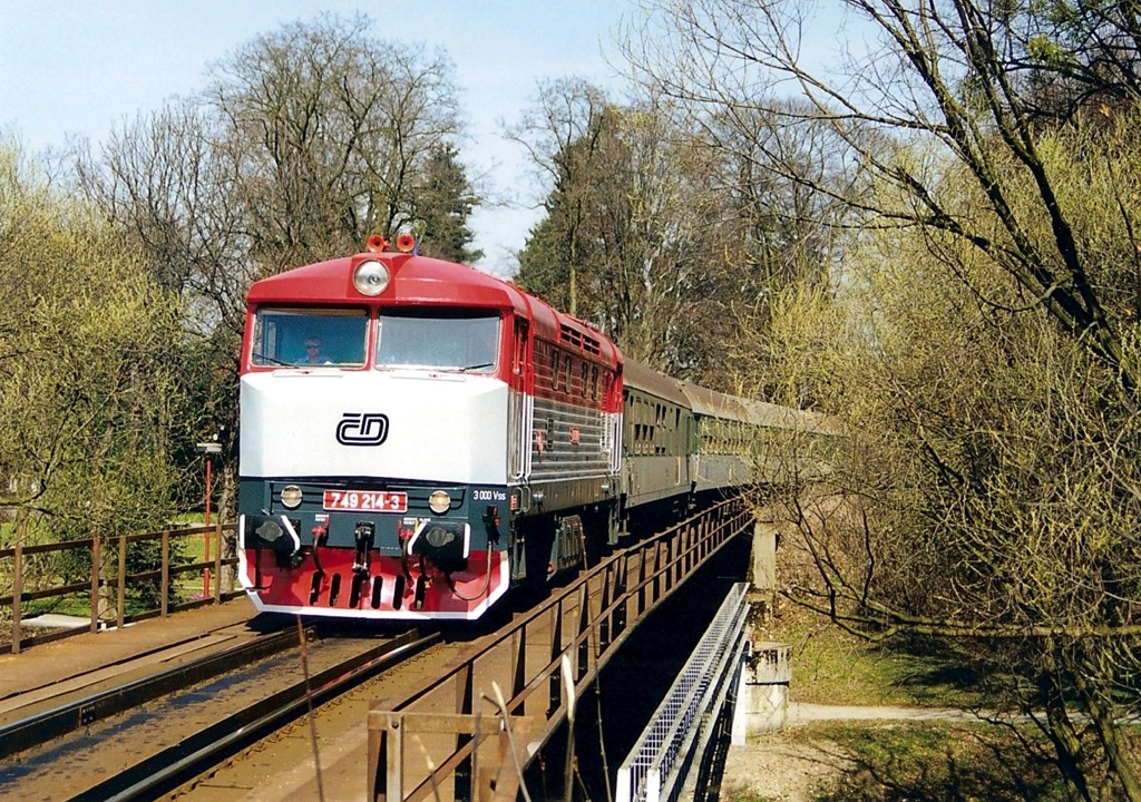 Krátce po provedení nového nátěru v klasických barvách byla 749 214-3 s vlakem Os 3719 zvěčněna v Zábřehu na Moravě 3. 4. 1999.