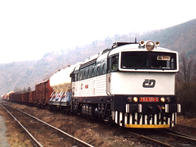 Později barbarsky zrušená chomutovská perla 753 120-5 právě přijela do Roztok u Křivoklátu - listopad 1998.