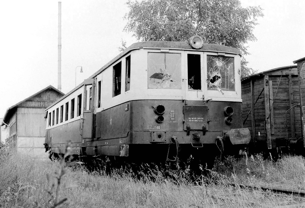 Násilně poškozený motorový vůz M262.0066 s obavami čeká v prostoru depa Zdice na dění zbývajících dní své nedlouhé pozemské pouti 9. 6. 1983.
